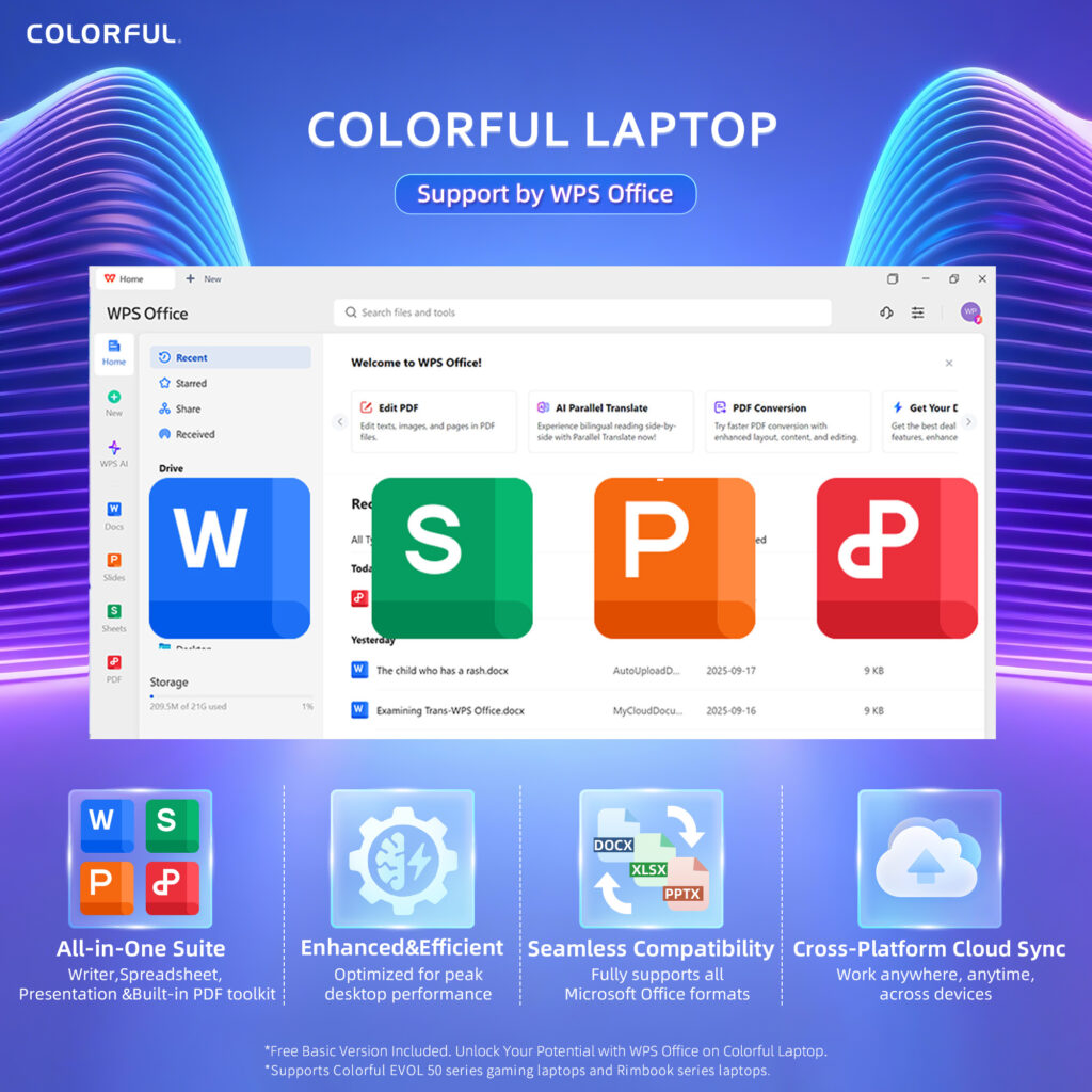 Selain mendukung performa untuk gaming dan aktivitas kreatif, seri EVOL P15 juga dirancang untuk kebutuhan produktivitas sehari-hari dan penggunaan akademik, dengan WPS Office yang sudah terpasang di sistem operasi Windows 11 Home.
