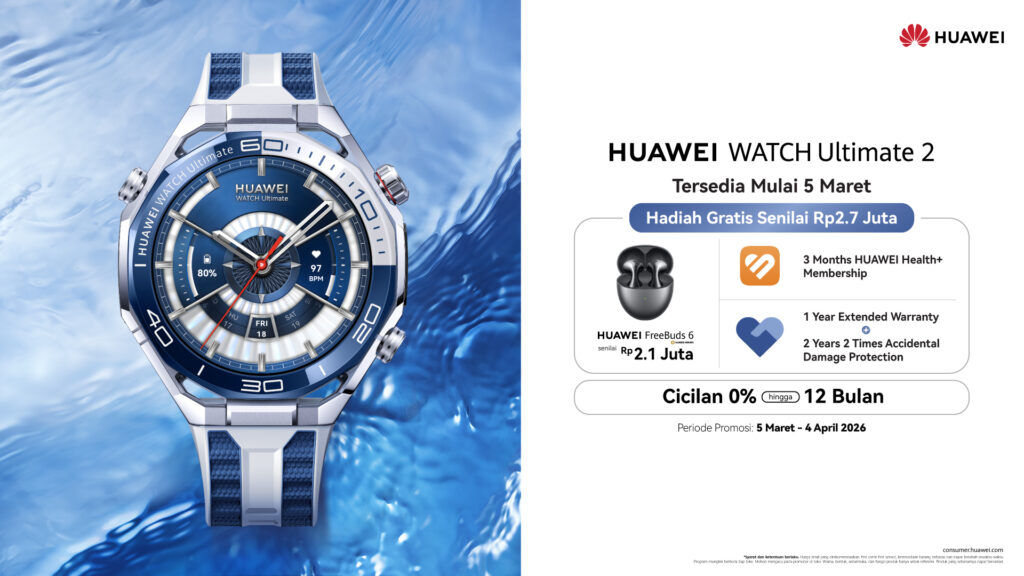 HUAWEI WATCH Ultimate 2 akan resmi tersedia mulai 5 Maret 2026, lengkap dengan penawaran spesial berupa promo dan hadiah gratis senilai hingga Rp 2,7 juta yang berlaku selama periode 5 Maret hingga 4 April 2026.