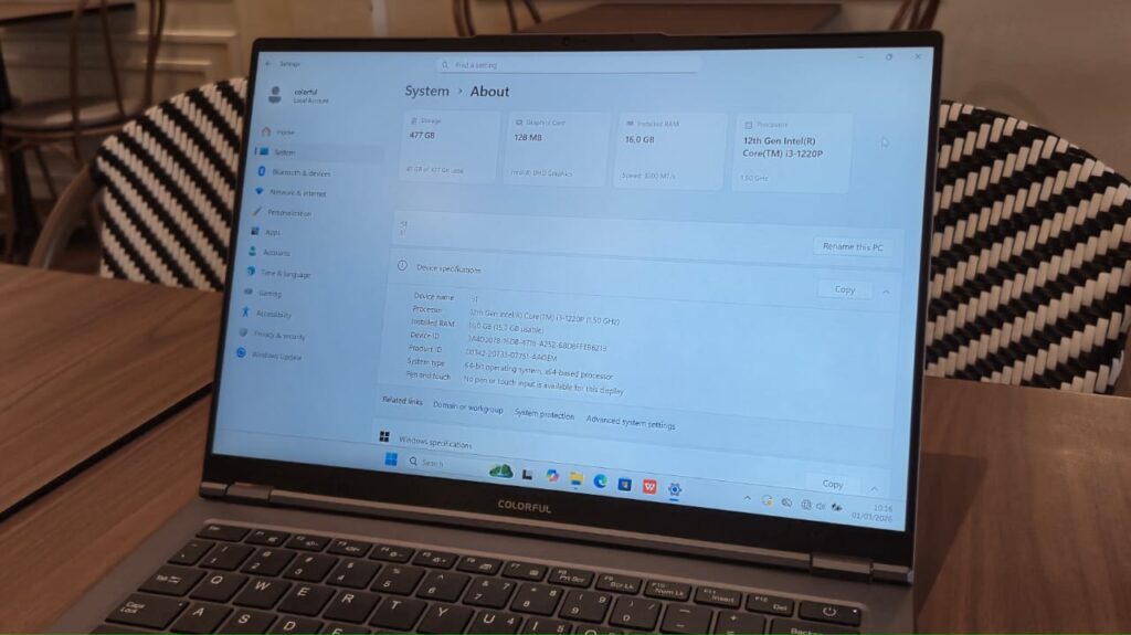 Bagi kamu yang tertarik meminang Colorful Rimbook S1, laptop ini telah ditenagai prosesor Intel Core i3-1220P dengan konfigurasi 10 core (2 performance core + 8 efficient core) dan 12 thread. Processor ini memiliki kecepatan hingga 4.4GHz dengan cache 12MB.