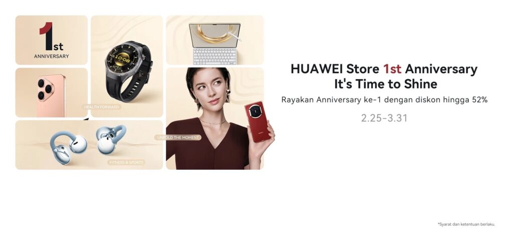 Selain itu, pada periode 25 Februari–31 Maret 2026, konsumen dapat membeli HUAWEI Mate X7 melalui HUAWEI Official Store dan menikmati keuntungan eksklusif, seperti cashback bank hingga Rp 5 juta untuk pembayaran menggunakan kartu kredit dan garansi resmi 2 tahun.