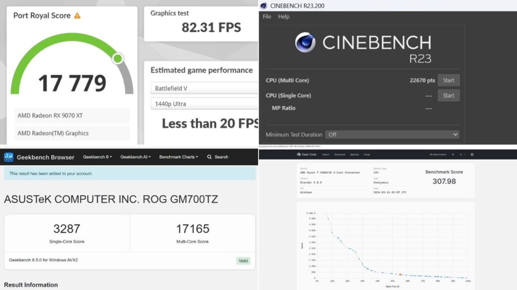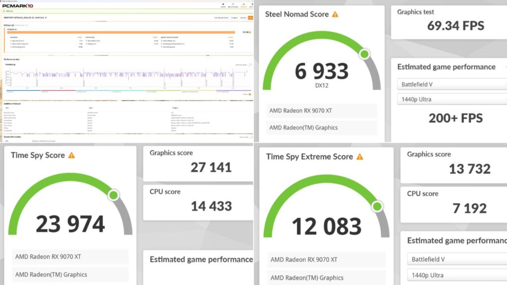 - Performa Grafis DirectX 12 (3DMark Time Spy & Time Spy Extreme) masing-masing dapat skor 23.974 dan 12.083 dengan fan turbo. Tanpa perlu fan full speed, pengujian menunjukkan GPU Radeon RX 9070 XT PRIME berjalan sangat optimal. Angka ini adalah jaminan bahwa game-game berbasis DirectX 12 akan berjalan dengan sangat lancar pada resolusi 1440p hingga resolusi 4K murni. Ini membuktikan bahwa manajemen panas dan aliran udara casing G7 dirancang dengan sangat cerdas untuk menjaga kestabilan performa tanpa perlu bising.