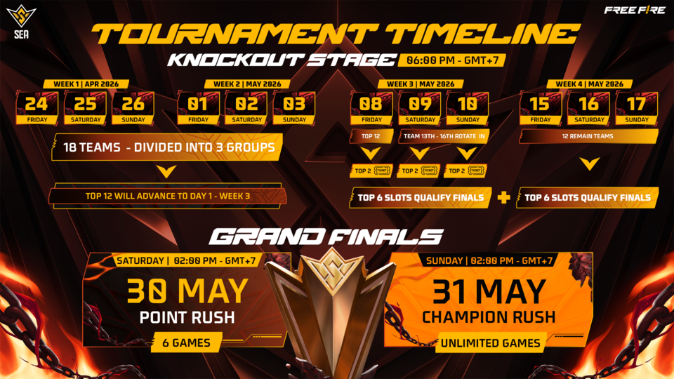 Rangkaian turnamen akan diawali dengan babak Knockout pada 24 April – 17 Mei 2026, sebelum berlanjut ke Grand Finals yang akan digelar secara offline pada 30–31 Mei 2026 di Military Zone 7 Stadium, Ho Chi Minh City, Vietnam.
