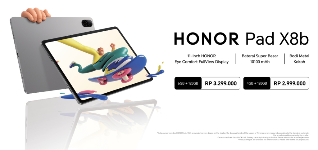 HONOR Pad X8b hadir dalam pilihan warna Space Grey dan akan tersedia mulai 24 April 2026 melalui HONOR Experience Store dan Erafone terdekat dengan harga Rp 2.999.000 untuk varian 4GB/128GB dan Rp 3.299.000 untuk varian 6GB/128GB.