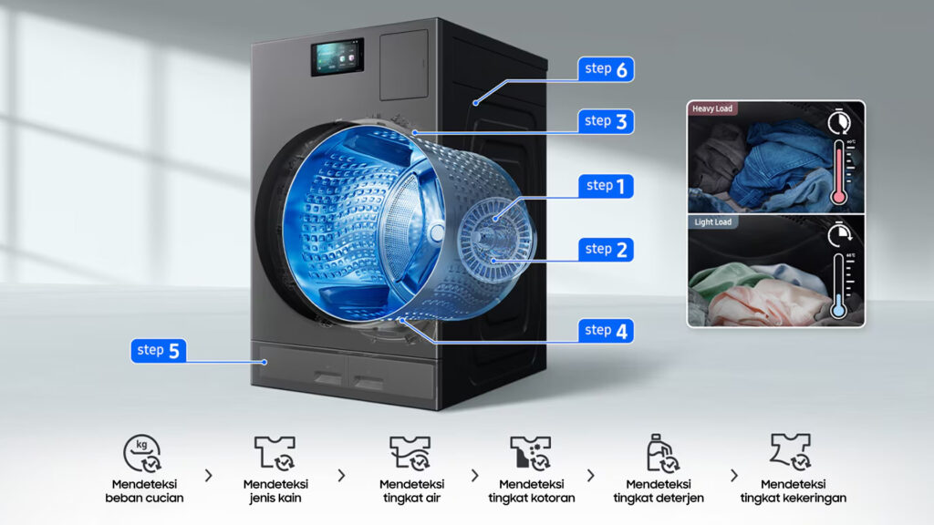 Dari sisi waktu, fitur Super Speed memungkinkan proses mencuci dan mengeringkan berlangsung lebih cepat. Sementara itu, AI Wash & Dry secara otomatis mendeteksi berat, jenis kain, dan tingkat kotoran untuk mengoptimalkan penggunaan air dan siklus pencucian.