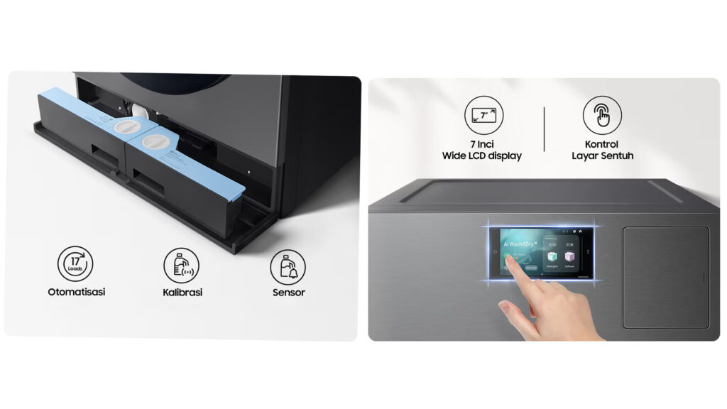 Fitur Flex Auto Dispense System memastikan penggunaan deterjen dan pelembut lebih presisi secara otomatis, sementara integrasi AI Home dan SmartThings memungkinkan kontrol yang lebih praktis dan terhubung dalam keseharian.